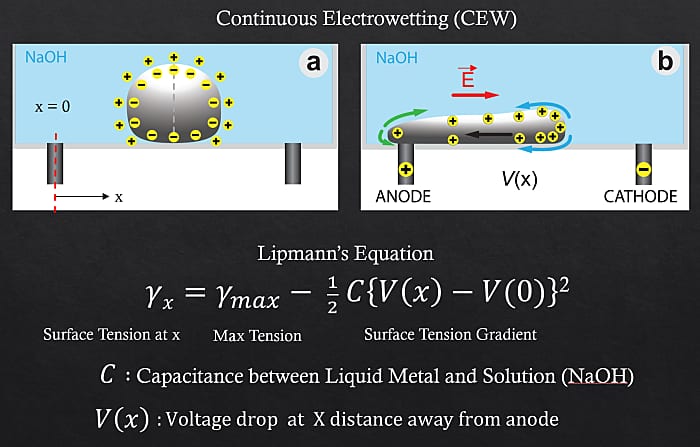 This project investigated a novel control method to program the shape of a liquid metal and allow unique organic animations based on spatio-temporally controlled electric fields. In particular, we successfully manipulated a droplet of liquid metal (Gallium Indium eutectic alloy) by a 7x7 electrode array prototype system, featuring an integrated image tracking system and a simple GUI. Exploiting the strong dependance of EGaIn’s surface tension on external electric voltages, multiple electrodes are dynamically controlled to manipulate the liquid metal into a fine-grained desired shape. Taking advantage of the high conductivity of liquid metals, a shape-changing, reconfigurable smart circuit can be considered as one of unique applications of the proposed method. We explored system constraints and the overarching challenge of controlling liquid metals in the presence of phenomena such as splitting, self-electrode interference and finger instabilities. Through this project, we aimed to open the new possibility of liquid based programmable matter for soft robotics, physically reconfigurable electronic devices, and new media art display.